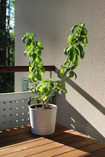 meillä kasvoi parvekkeella kesällä yrttejä ja kukkia, mutta kesälaitumilta palatessani basilika oli ainoa, joka oli enää hengissä. se oli kyllä kasvanut kaikkien muidenkin edestä ja päätin istuttaa sen kokonaan uuteen ruukkuun ja ottaa sisälle keittiöön, ettei se vaan palellu nyt, kun yöt ovat jo aika viileitä. kuvassa sekin on nauttimassa auringosta uudessa ruukussaan parvekkeella.